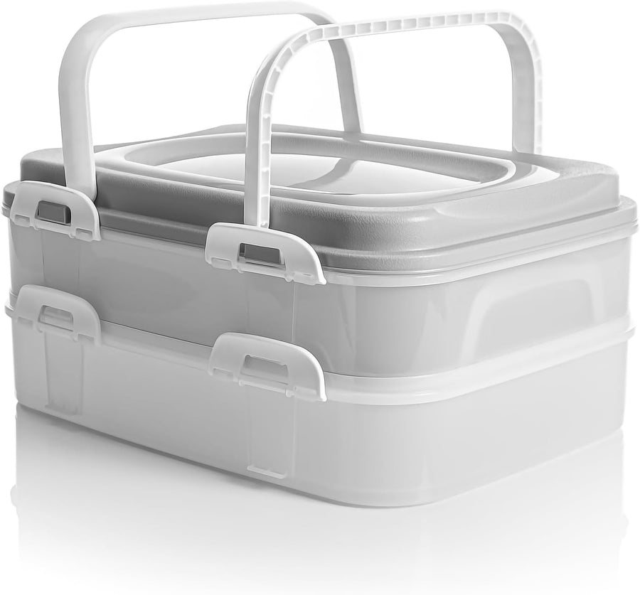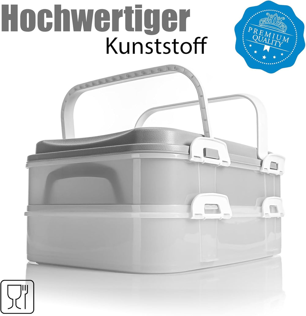 BigDean Partycontainer mit 2 Etagen und Hebeeinsatz in Pastell Grau – für Backwaren, Snacks & Kuchen