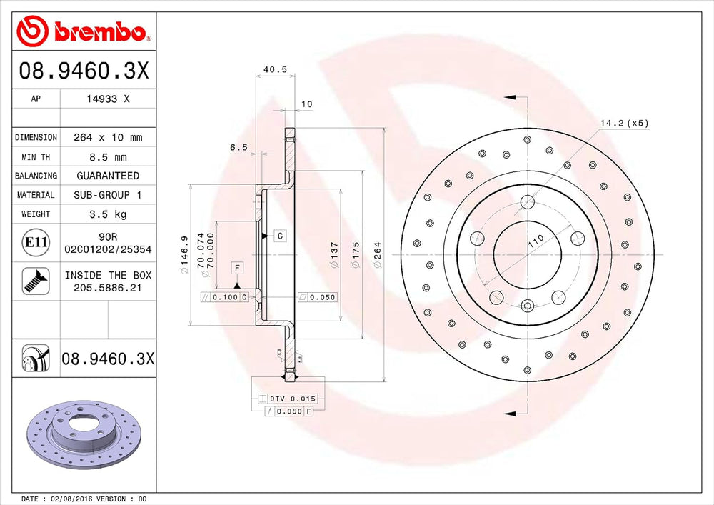 Brembo 08.9460.11 Hintere Bremsscheibe, Anzahl 2
