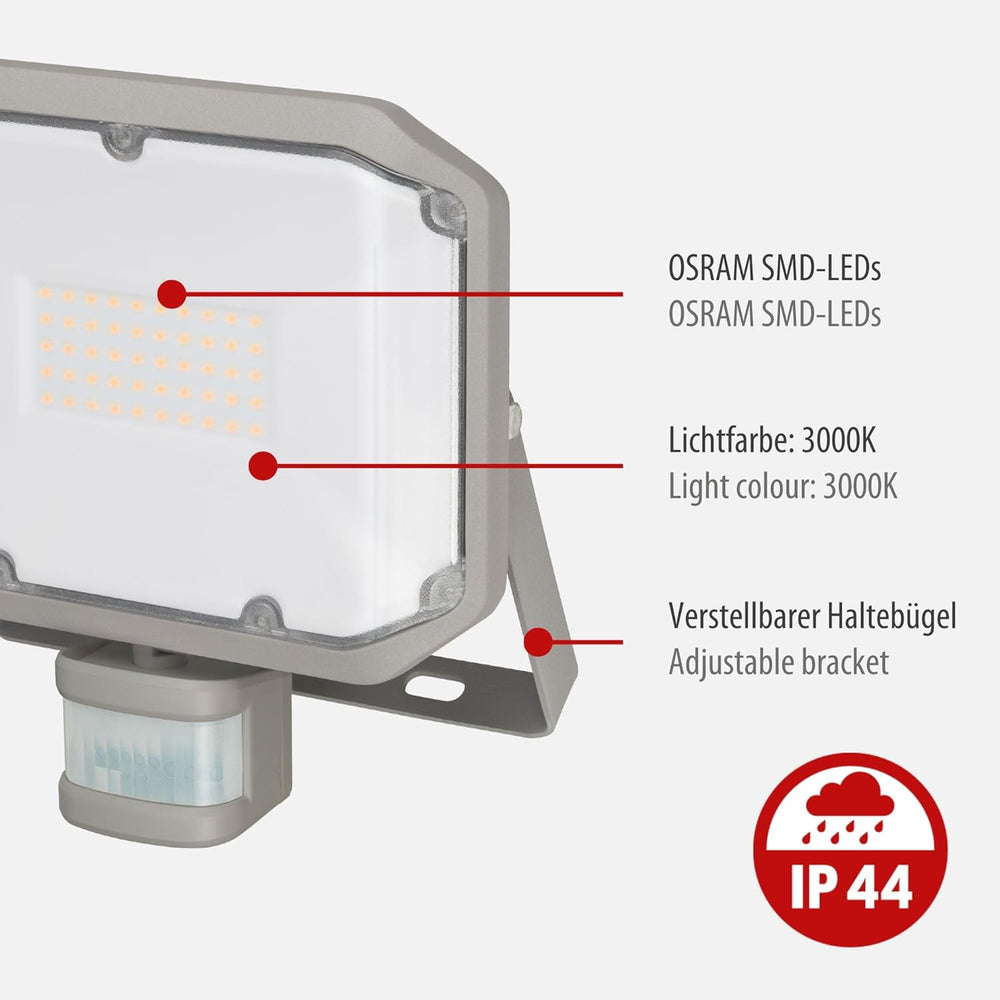 Brennenstuhl LED Strahler AL 3050 mit PIR (30W, 3110lm, 3000K, IP44, LED Fluter zur Wandmontage mit