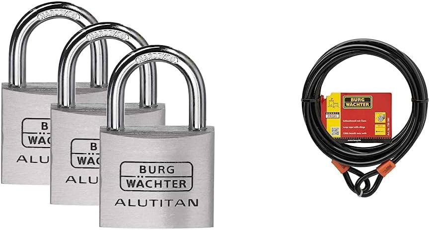 BURG-WÄCHTER 3er-Set Vorhängeschloss mit Schlüssel, Gleichschliessend & Sicherheitskabel mit Ösen, U