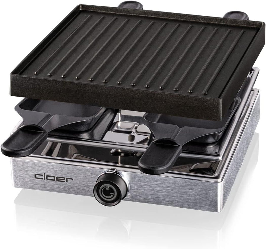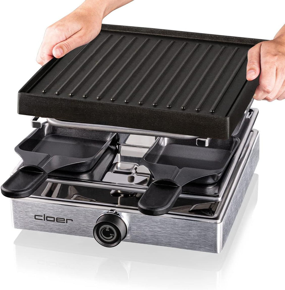 Cloer 6454 Raclettegrill mit Aluminium-Druckguss Platte, 750 W, 4 antihaftbeschichtete Raclettepfänn