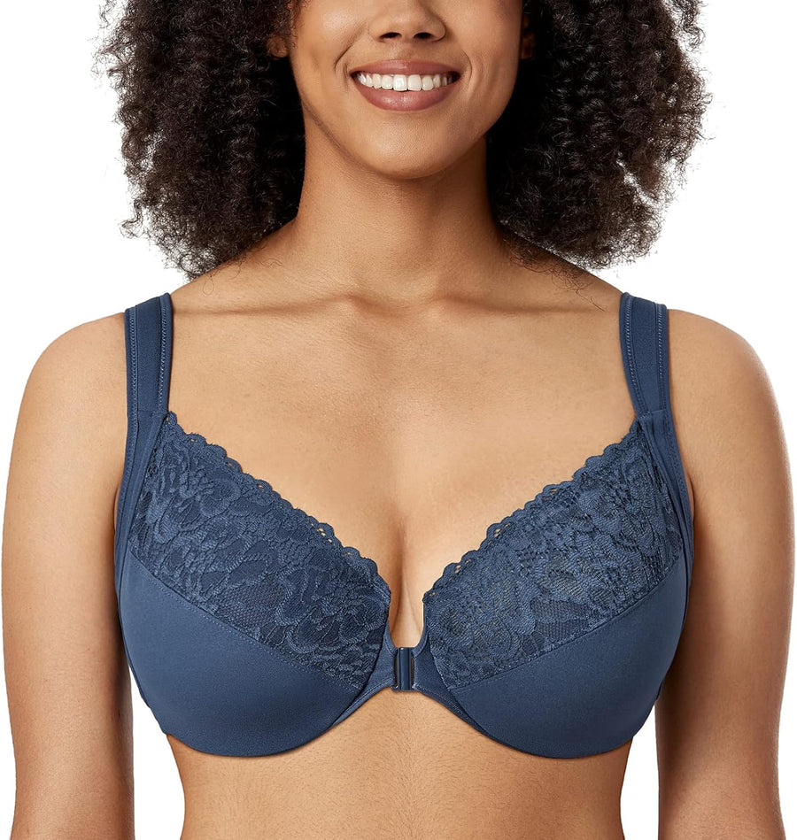 DELIMIRA Damen BH mit Vorderverschluss U-Rücken Bügel Spitzen BHS Grosse Brüste Soft Vollschalen Ung