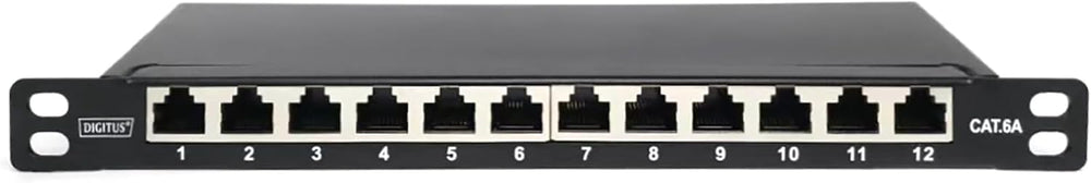 DIGITUS Cat-6A Patchpanel - 12 Ports - RJ45-Buchsen - 10-Zoll Rack-Mount 0.5HE - LSA Verteilerfeld -