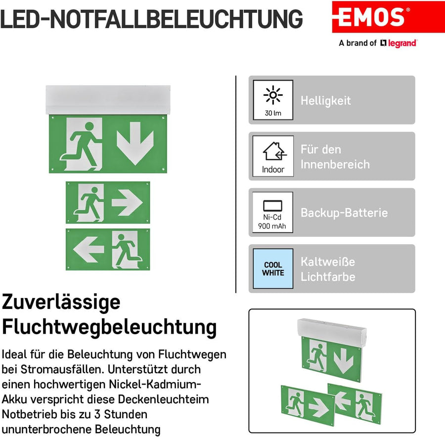 EMOS LED Notbeleuchtung, Notausgangsschild bis zu 3h Notfall-Modus, Fluchtwegleuchte mit Manuell-Tes