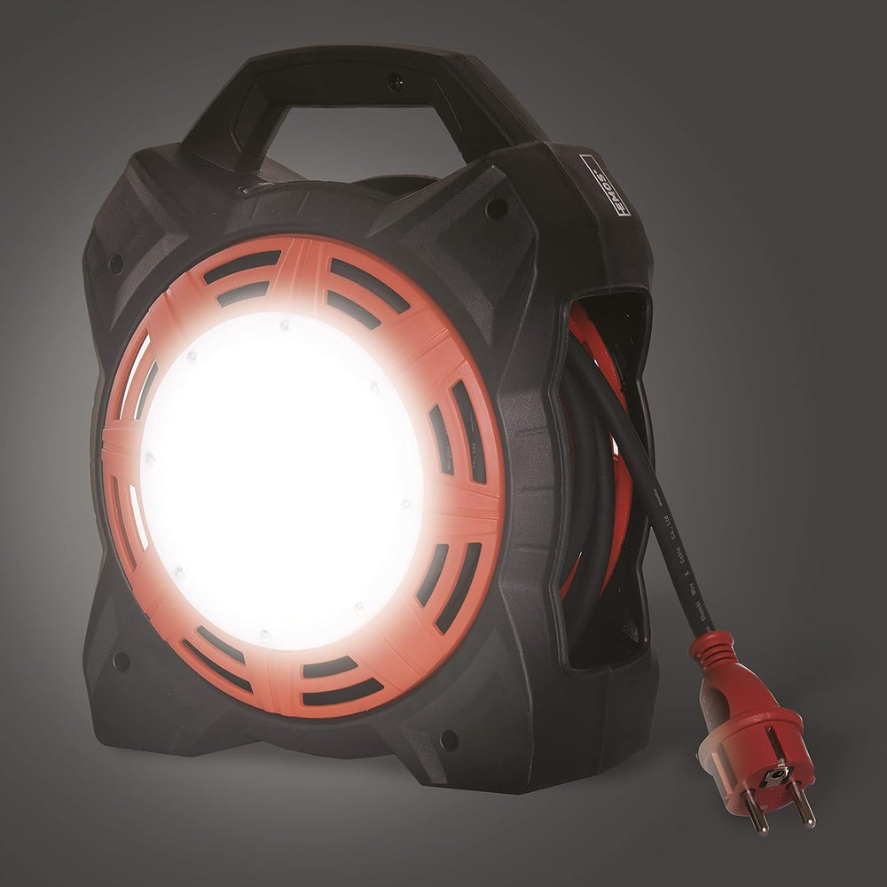 EMOS Kabeltrommel mit LED-Strahler, 15m Outdoor-Kabelbox Schuko und 20W Fluter & as - Schwabe Campin