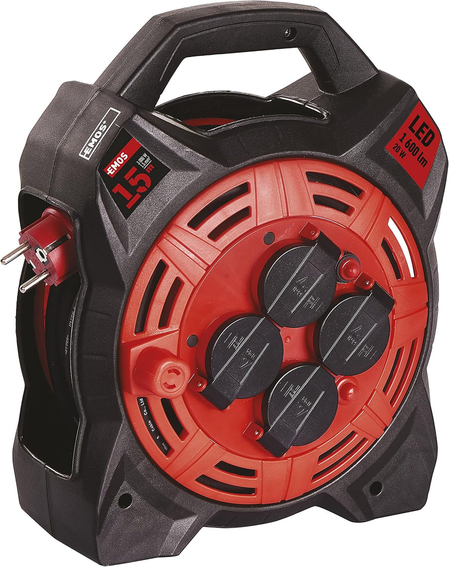 EMOS Kabeltrommel mit LED-Strahler, 15m Outdoor-Kabelbox Schuko und 20W Fluter, Neopren-Gummikabel H