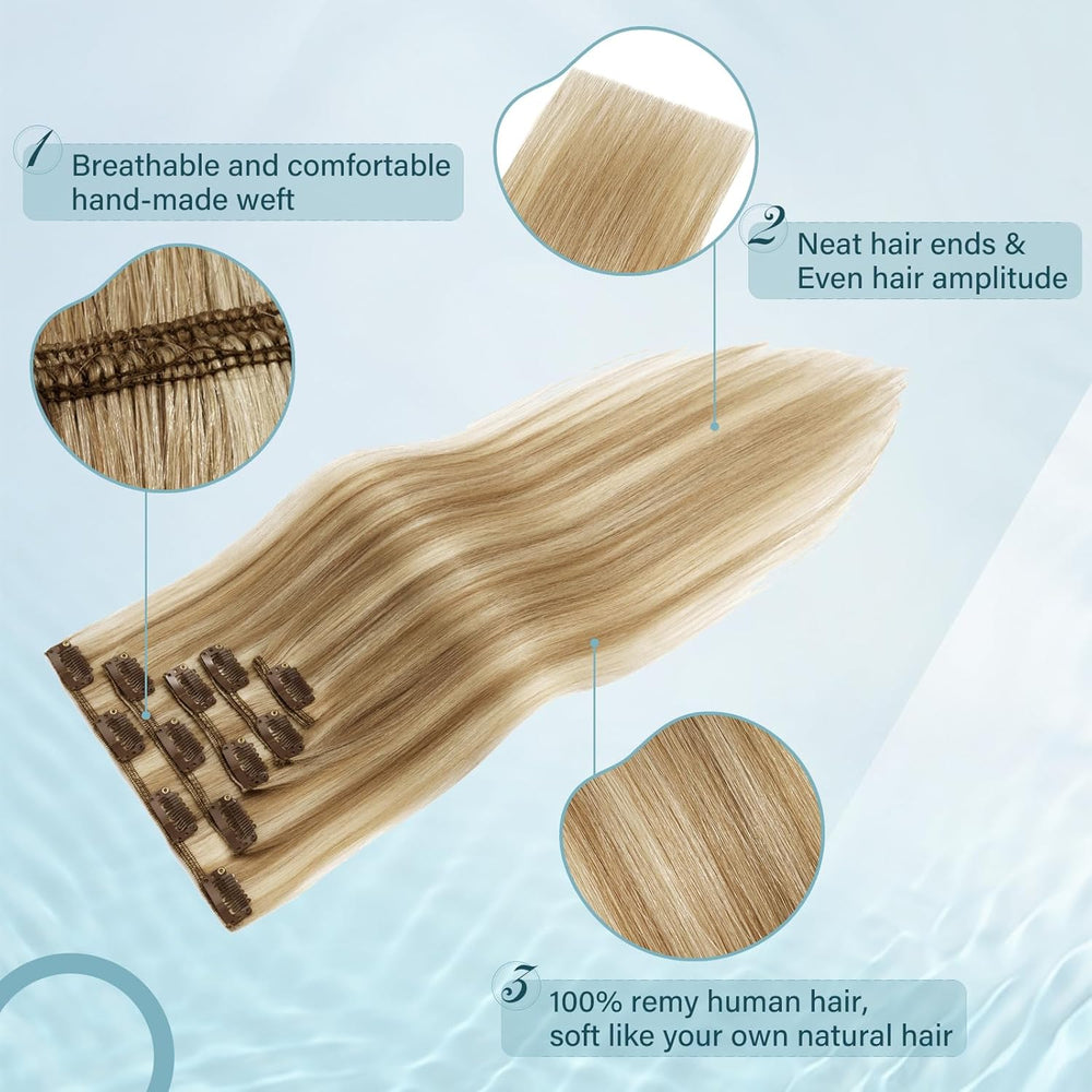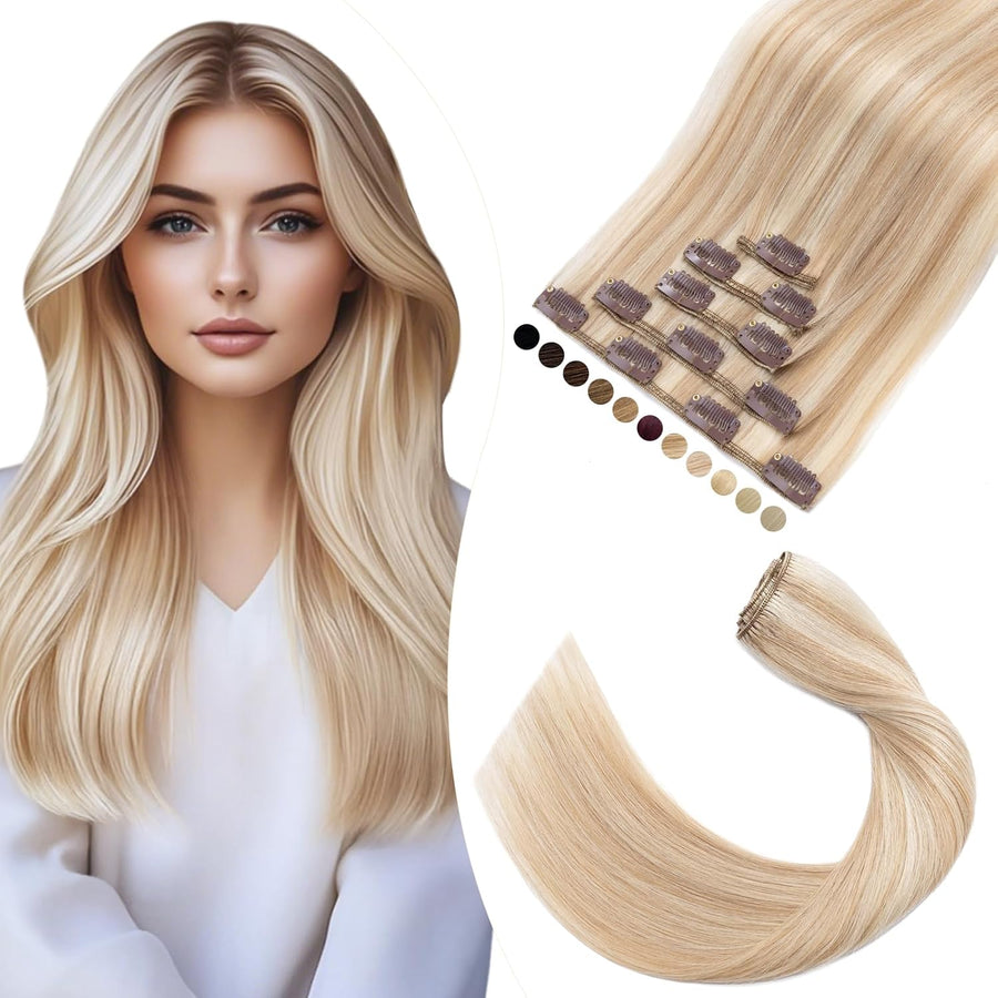 Elailite Echthaar Extensions Clip in #18P613 Aschblond mix Hellblond, 5 Tressen Remy Haarverlängerun