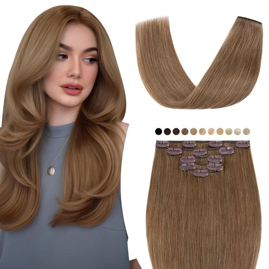 Elailite Echthaar Extensions Clip in #6 Hellbraun, 5 Tressen Remy Haarverlängerung mit 12 Clips, 35c