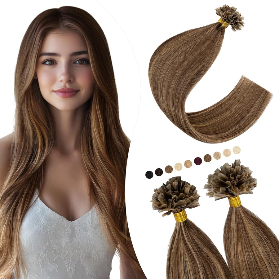 Elailite Extensions Bondings Echthaar 200 Strähne 40cm #4P27 Mittelbraun/Honigblond, U Tip Hair Exte