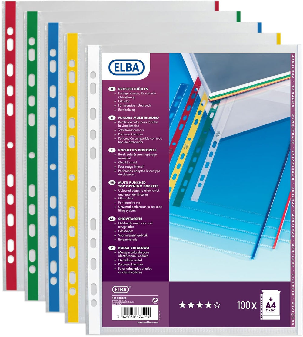 ELBA Hüllen perforiert A4 aus Polypropylen 9/100 verschiedene Farben 100 Pochettes sortiert, 100 Poc
