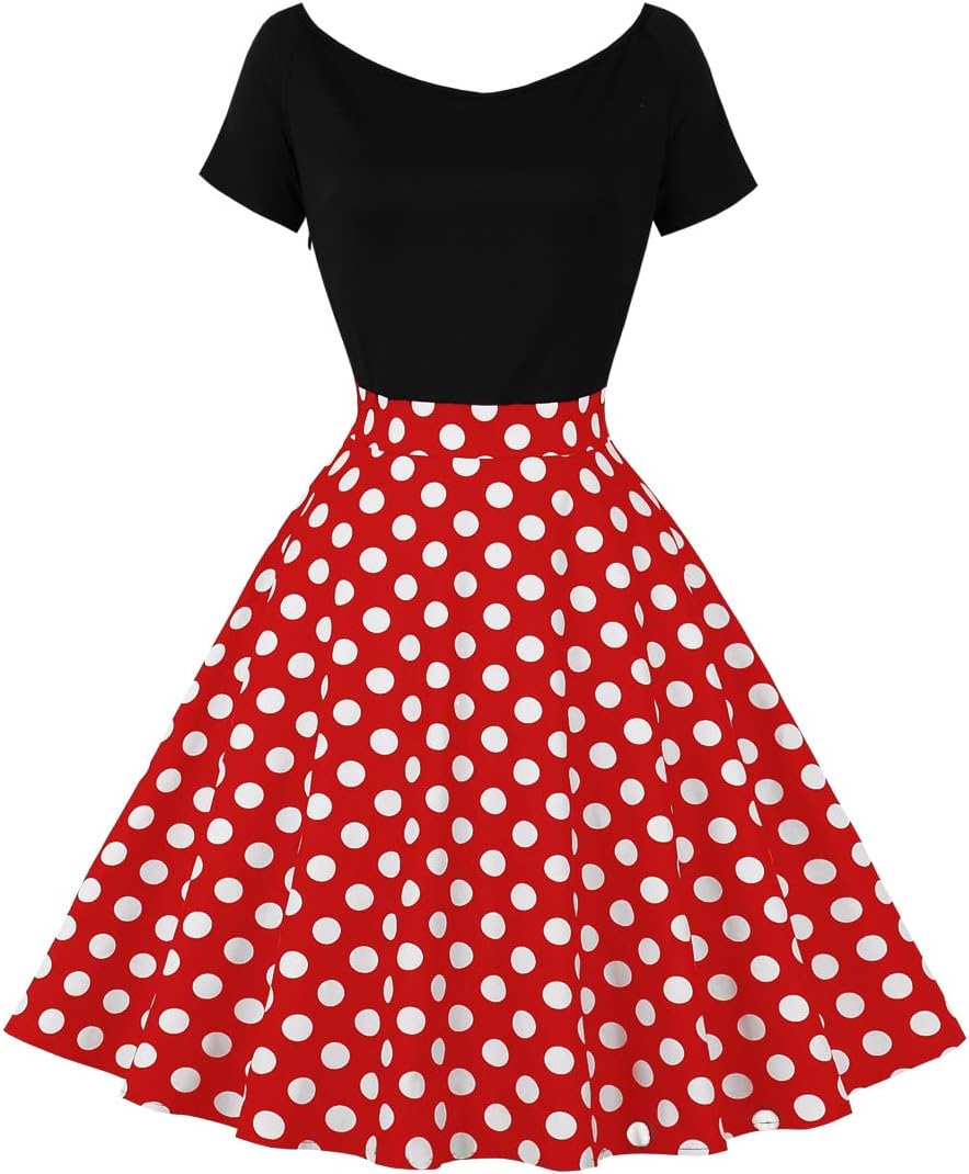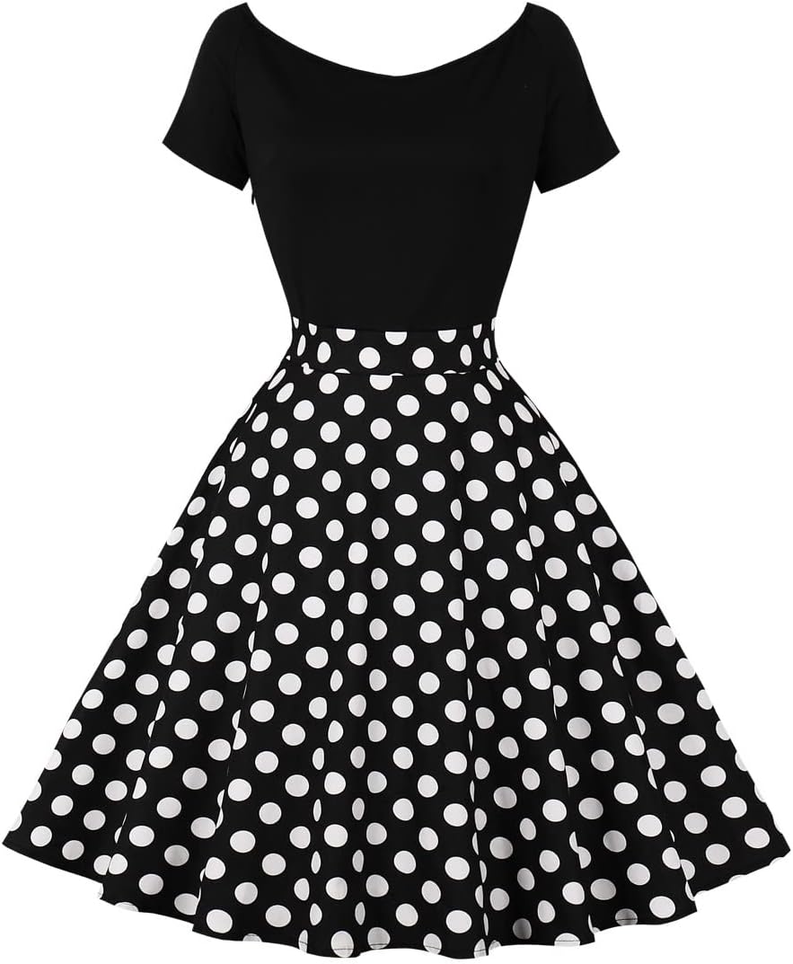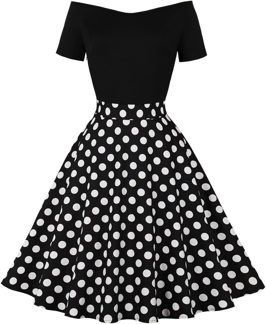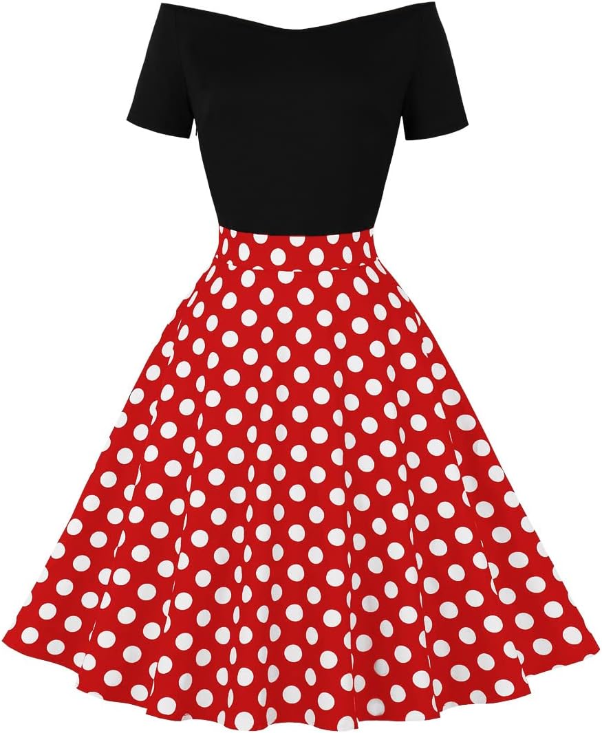 FYMNSI Rockabilly Kleider Damen Vintage Gepunktet Schulterfrei Kurzarm A-Linie Partykleid 50er Jahre