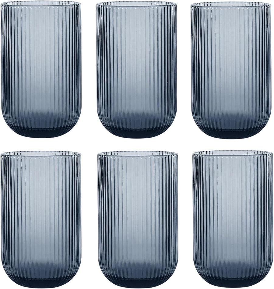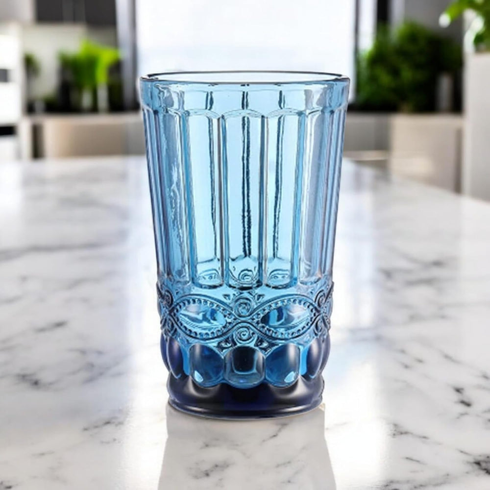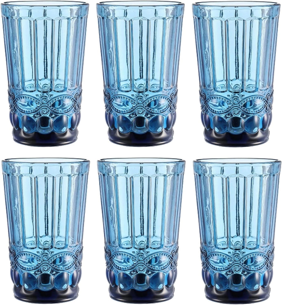 Vintage 6er-Set Farbige Weingläser und Trinkgläser mit Prägung Relief (Schleife, Blau, 400 ml) Weing