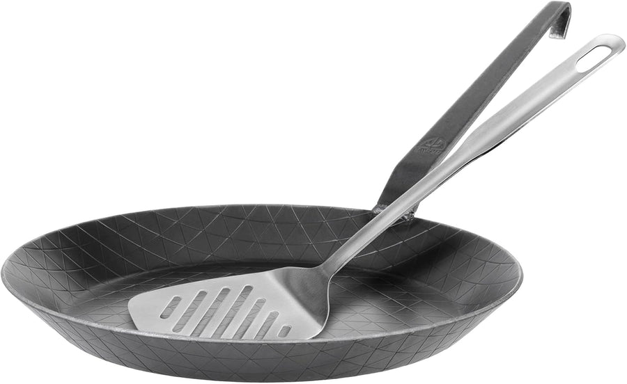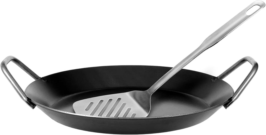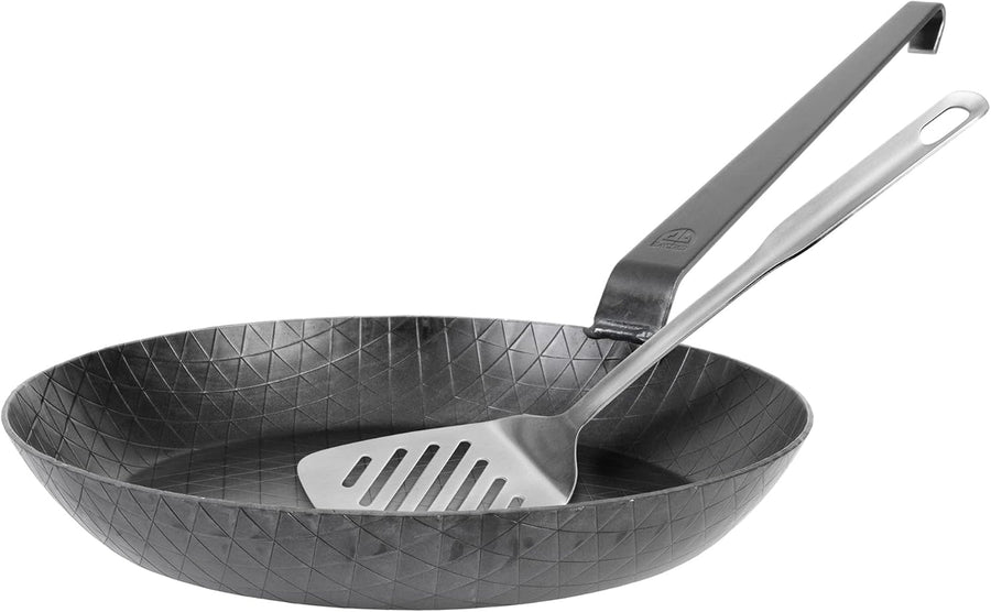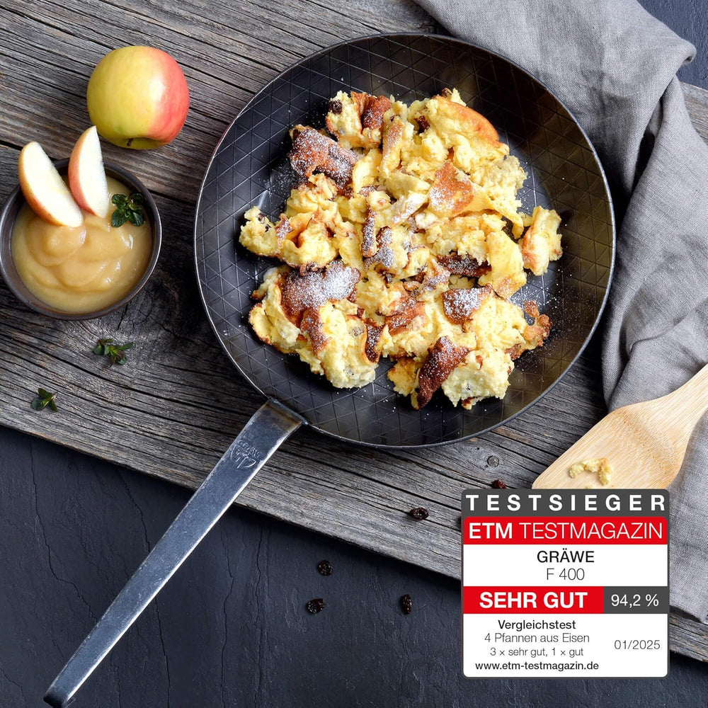 GRÄWE Schmiedeeiserne Bratpfanne F400, Ø 28 cm, Eisenpfanne mit Wender, 400° C hitzebeständig, Pfann