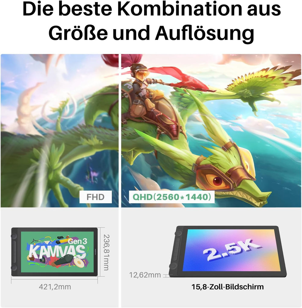 HUION Kamvas 16 Gen 3 2,5K QHD Grafiktablett mit Display, 15,8 Zoll Zeichentablett mit Entspiegeltem
