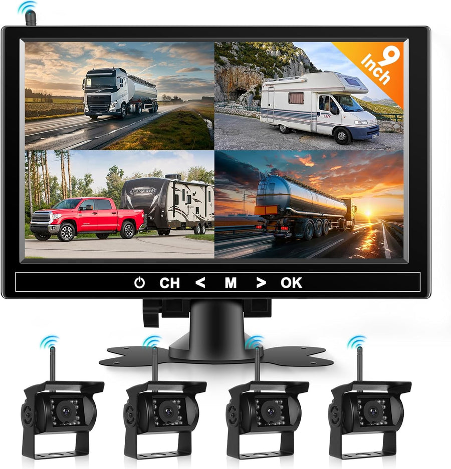 Hodozzy Rückfahrkamera Kabellos 4 Kameras 9 Zoll HD Monitor Wireless Rückfahrkamera Set, 18 IR-Nacht