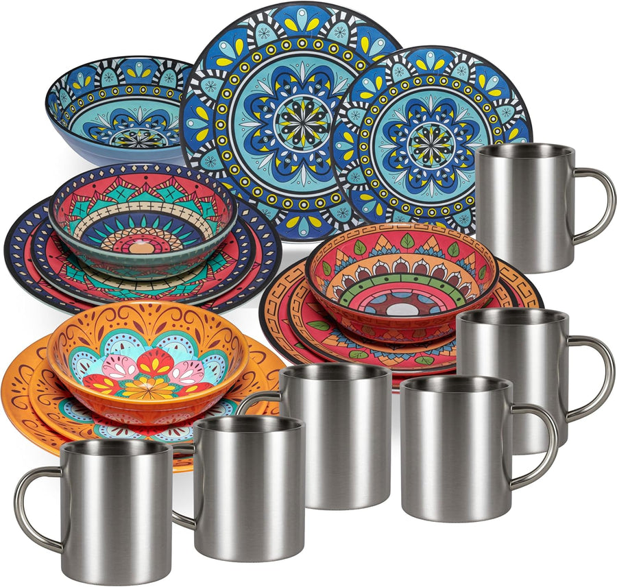 Melamin Geschirr Set Toskana Pastel für 4 Personen - BUNT - Mandala-Optik Spülmaschinengeeignet Essg