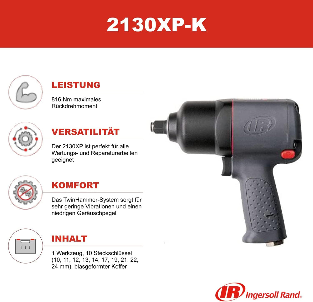 Ingersoll Rand Schlagschrauber 2130XP-K, mit 816 Nm Drehmoment, Steckschlüsselset mit 10 Nüssen, Vie