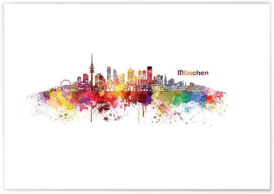 JUNIWORDS Poster mit/ohne Holzrahmen, Wähle ein Motiv, Aquarell Skyline München, Wähle eine Grösse,