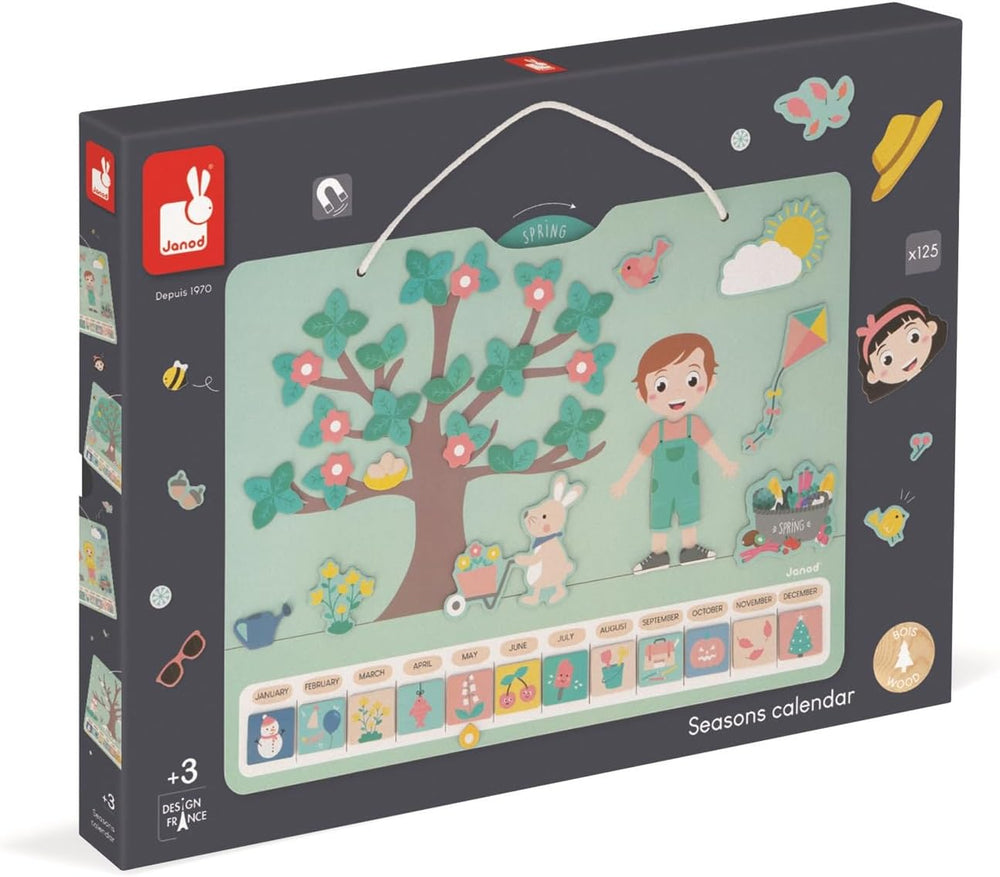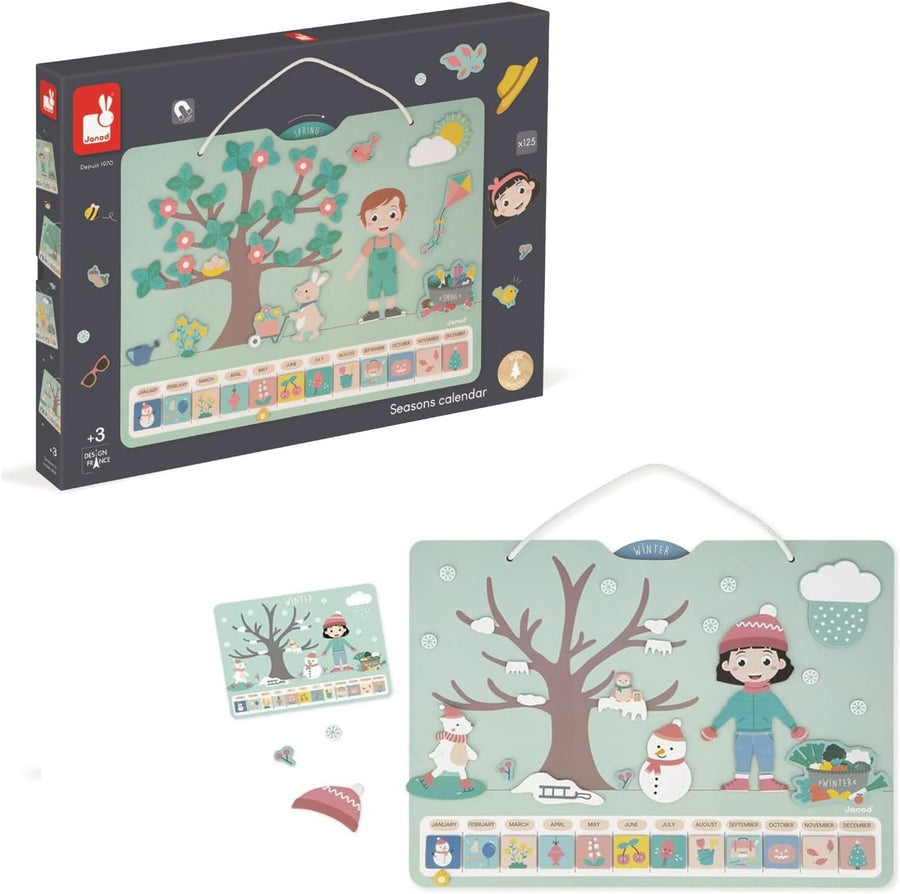 Janod - Jahreszeitenkalender – Holzkalender für Kinder 42 x 32 cm – magnetisch – 125 Magnete – Jahre