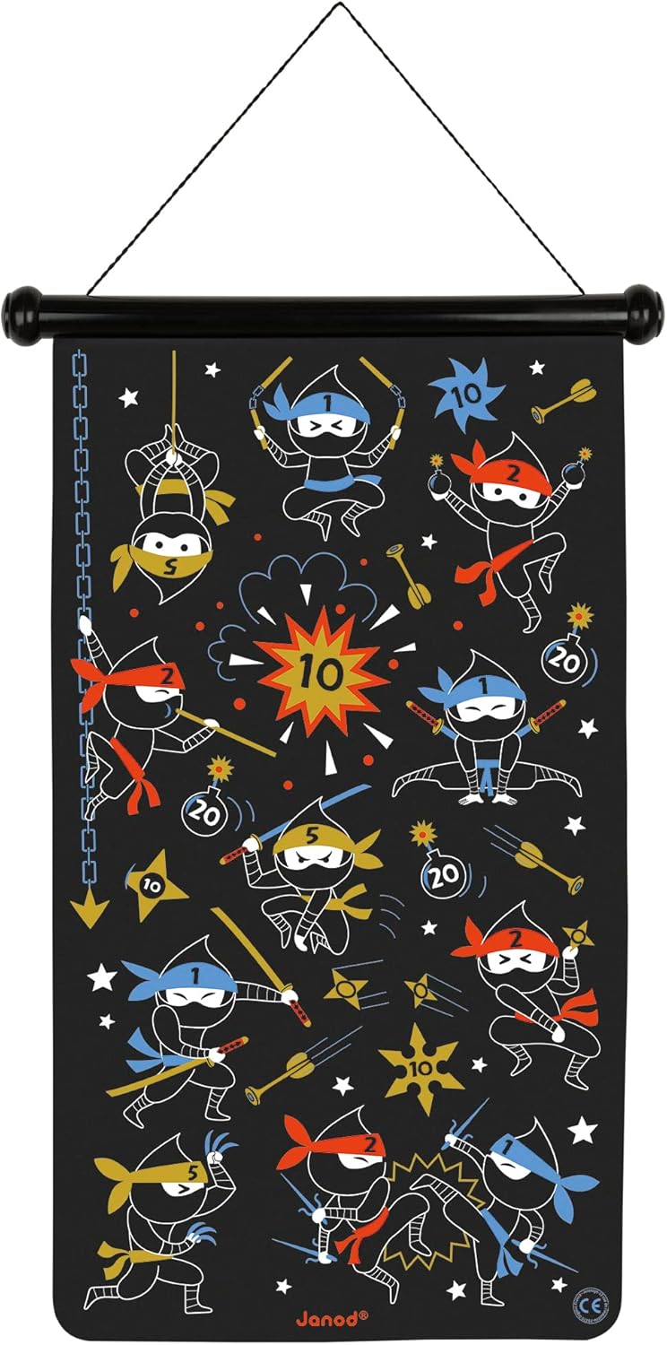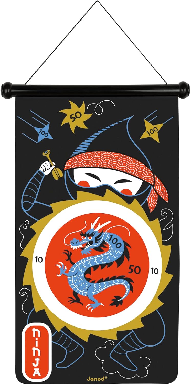 Janod - Magnetisches Dartspiel Ninja-Motive - 6 Plastikpfeile - Spiel aus Stoff, Beidseitig Nutzbar