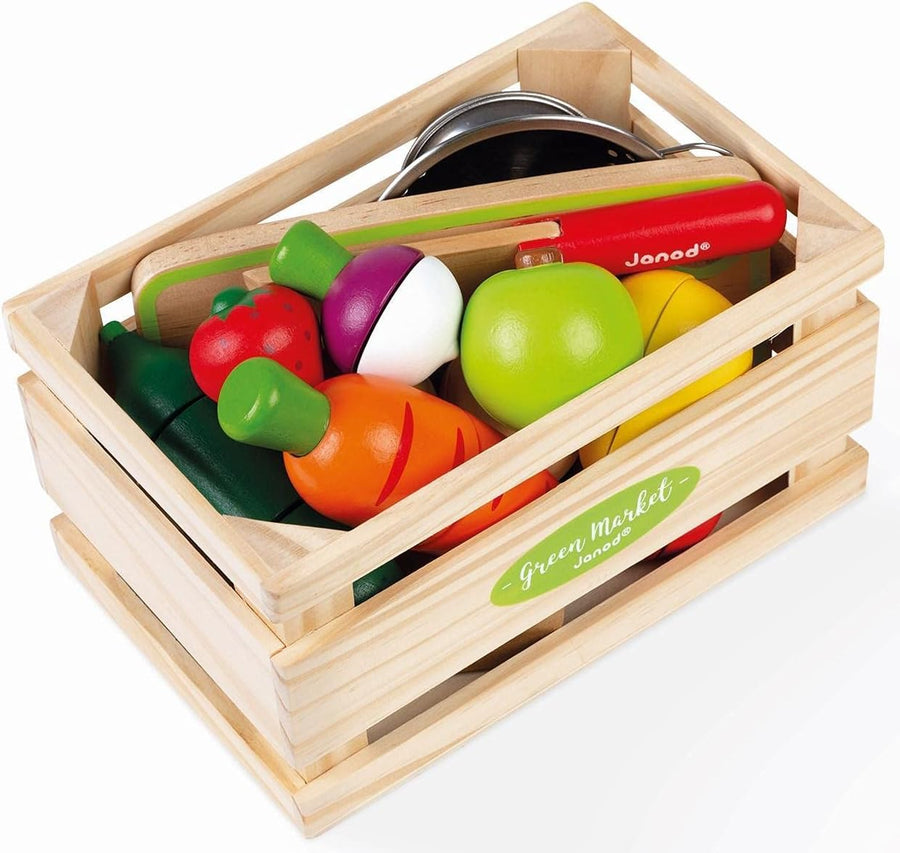 Janod - Holz Obst und Gemüse Spielset ‘Green Market’ - Marktkiste mit 9 Obst- und Gemüsesorten mit H