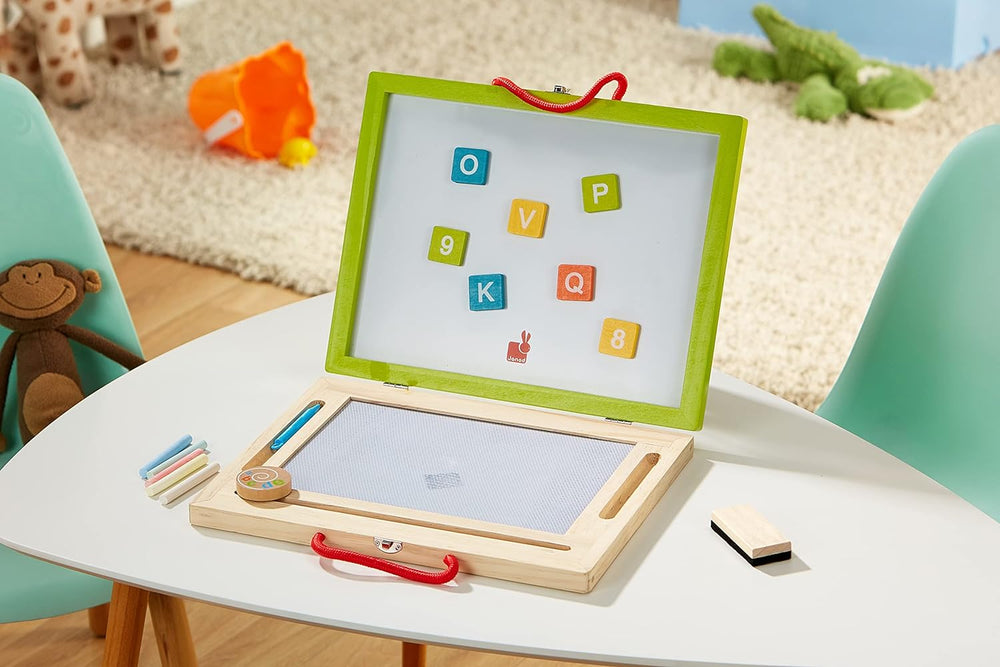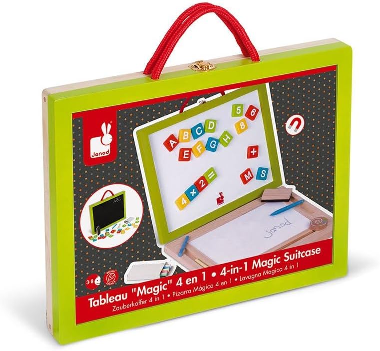 Janod - Kinder-Holzspielzeug 4-in-1-Tafel, Zaubertafel für diverse Aktivitäten, mit Zubehör und 42 M