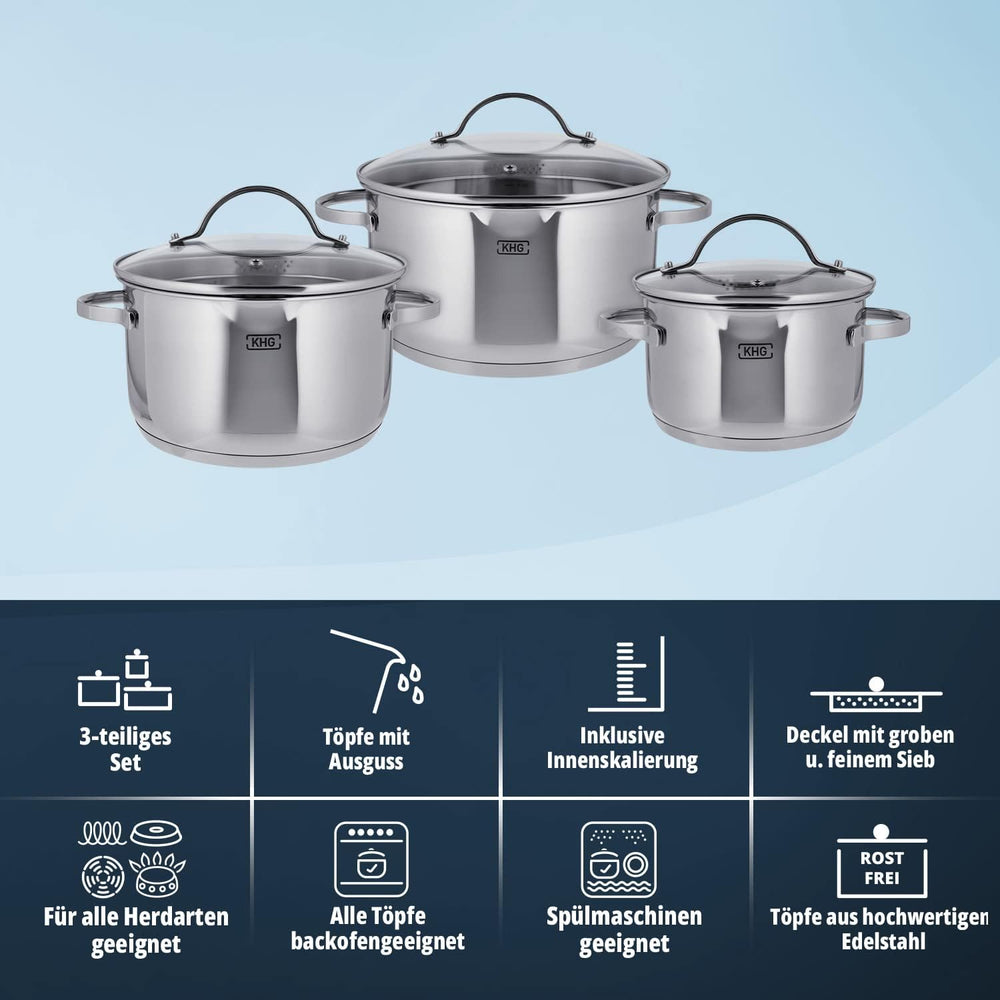 KHG Topfset 3 teilig Induktionstöpfe Edelstahl Rostfrei - 16 cm 20 cm 24 cm mit Ausguss Innenskalier