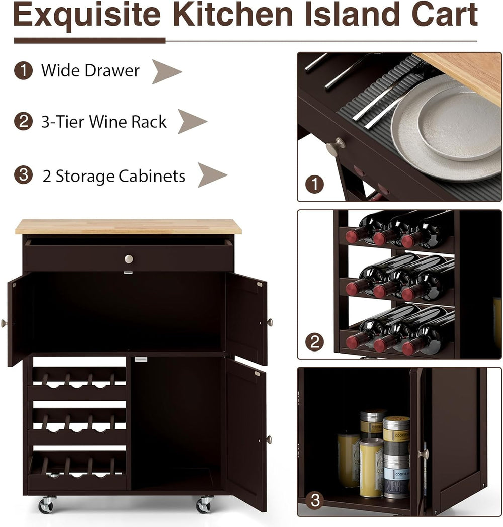 KOMFOTTEU Küchenwagen auf Rollen, Kücheninsel mit Weinregal & 2 Schränke & Schublade, Servierwagen a