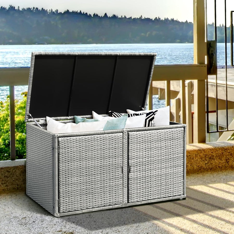 KOMFOTTEU Rattan Auflagenbox, Aufbewahrungstruhe mit Doppeltüren und Deckel, 2 stöckiger Gärtnerschr