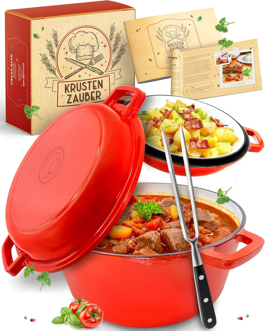 KRUSTENZAUBER Gusseisen Topf [inkl. Fleischgabel] - Hochwertiger 26cm Schmortopf backofengeeignet -