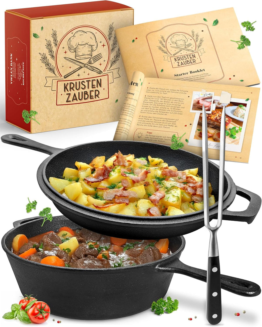 KRUSTENZAUBER Gusseisen Topf [inkl. Fleischgabel] - Hochwertiger 24cm Schmortopf backofengeeignet -