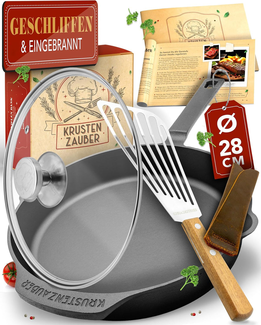 KRUSTENZAUBER Gusseisenpfanne Induktion 28cm inkl. Deckel und Pfannenwender - Geschliffene Pfanne Gu