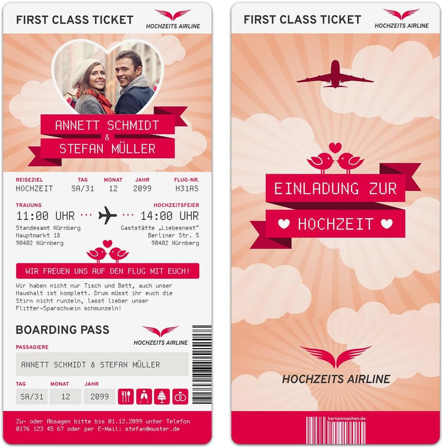 Kartenmachen.de Personalisierte Hochzeit Einladungen (10-100 Stück) - First Class Flugticket - Hochz