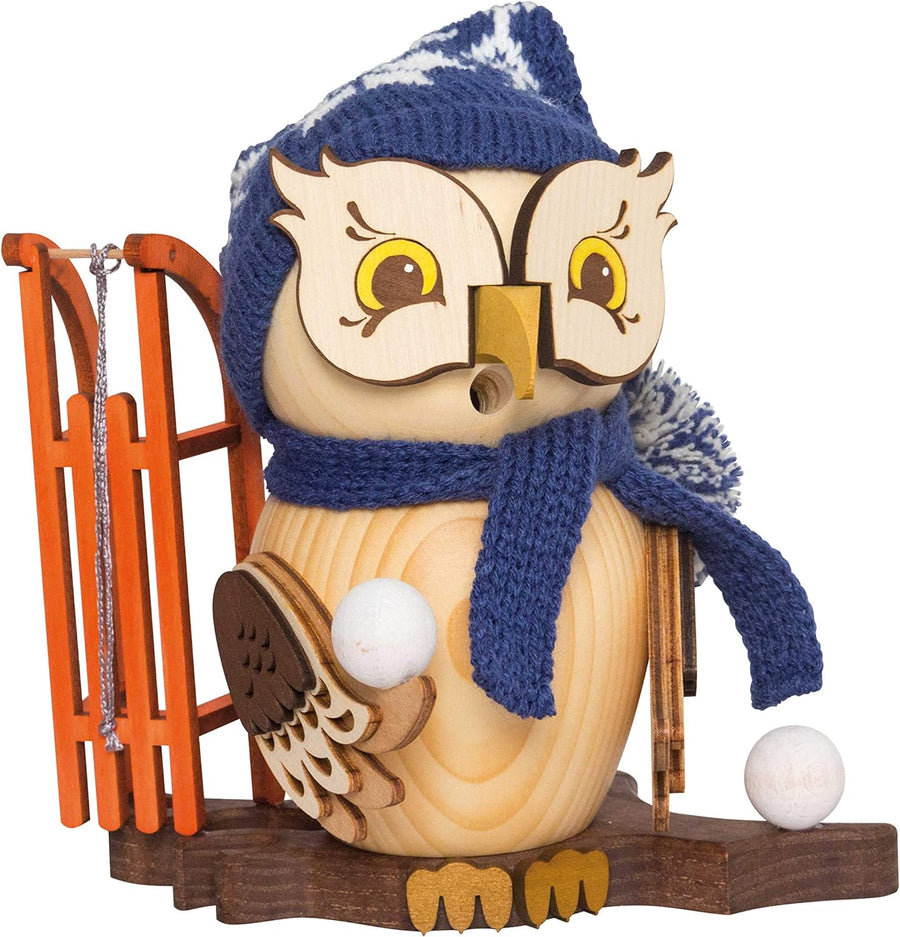 Drechslerei Kuhnert Rauchfigur/Räucherfigur - Eule mit Schlitten aus Massivholz - ca. 15 cm - Made i