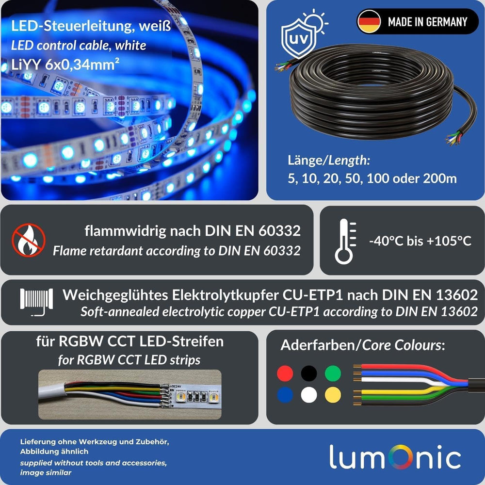 Lumonic 6x 0,34mm² LED Steuerleitung weiss 20m I ummanteltes 6 adriges Kabel flexibel I Geschirmtes