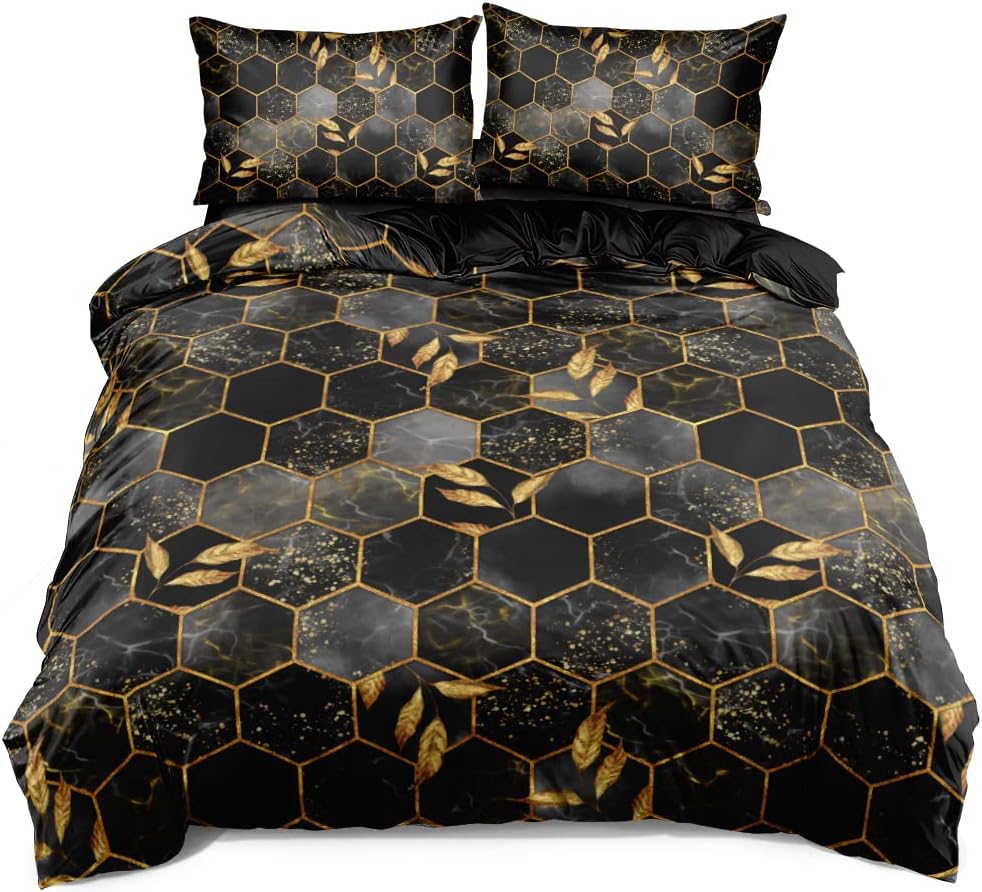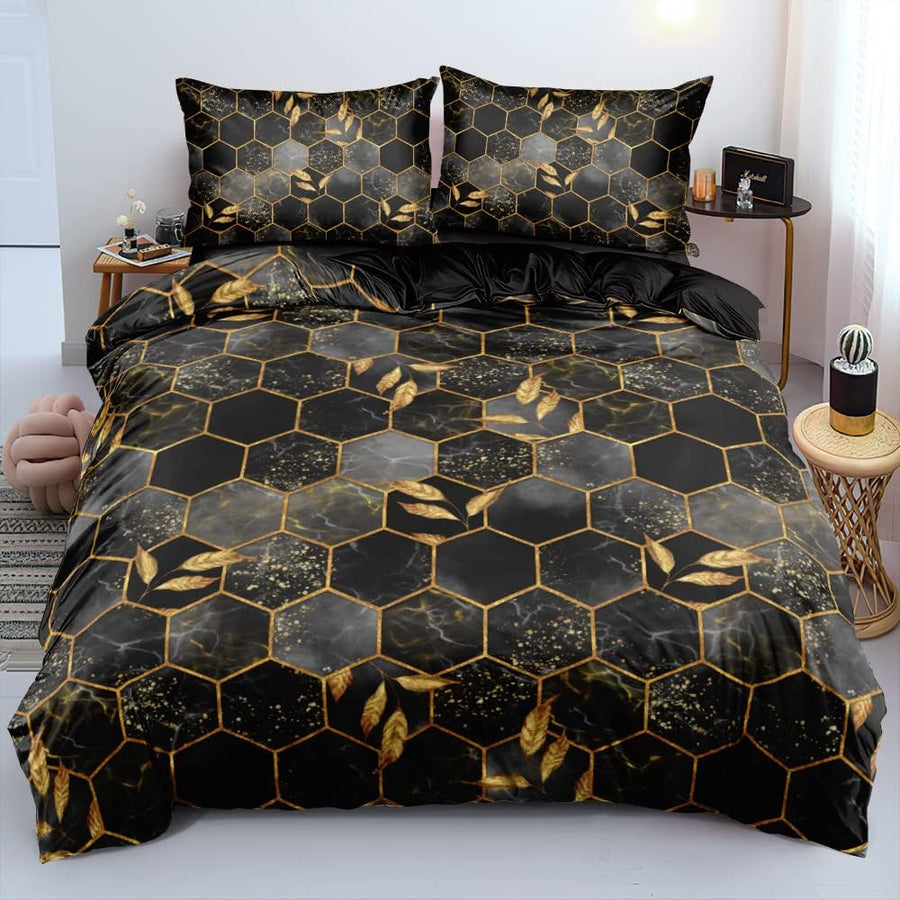 Schwarze Bettwäsche Set 200x220 cm Schwarz Gold Marmor Muster Karierte Bettwäsche Set Blätter 3D Mot