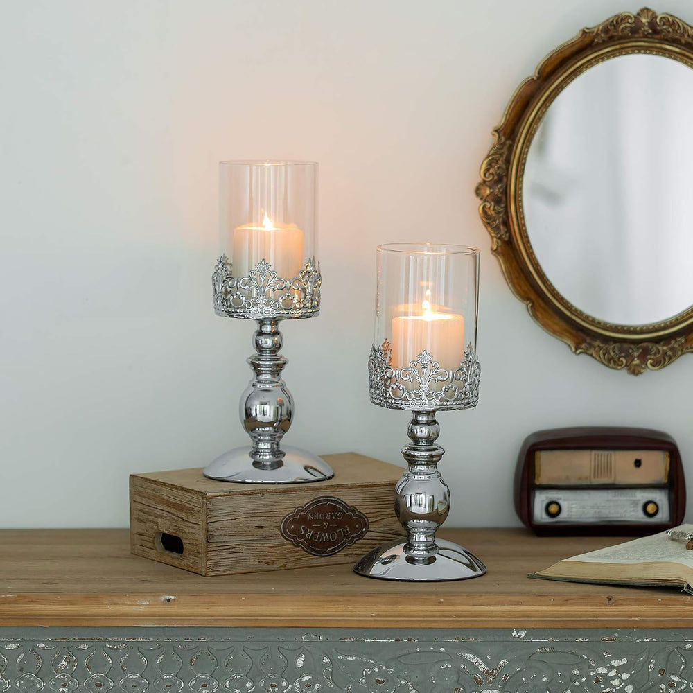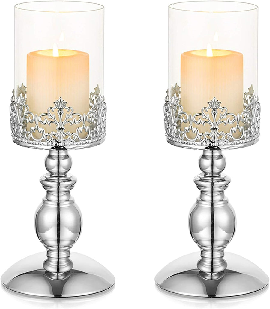 NUPTIO 2 Stück Silber Kerzenhalter für Stumpenkerzen, Hurricane Glas Kerzenhalter Wohnraum Dekor Ges
