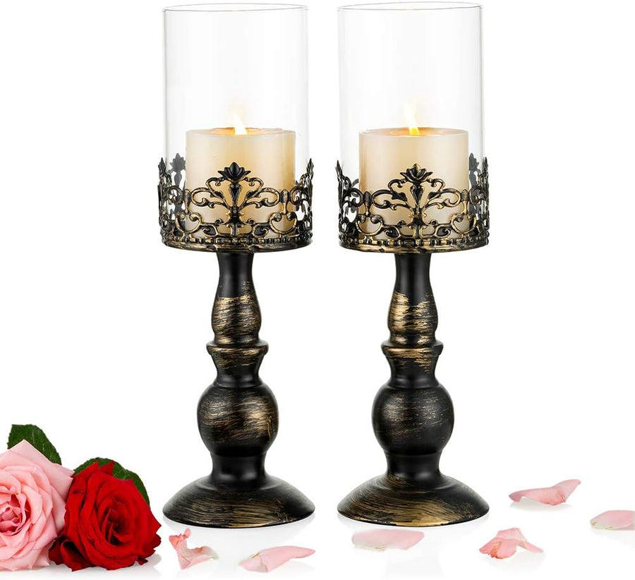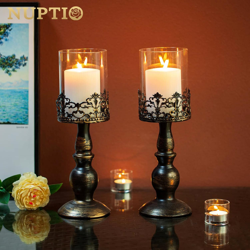 NUPTIO 2 Stück Vintage Kerzenhalter für Tische Kerzenhalter aus Schwarzer Säule mit Glasschirmabdeck