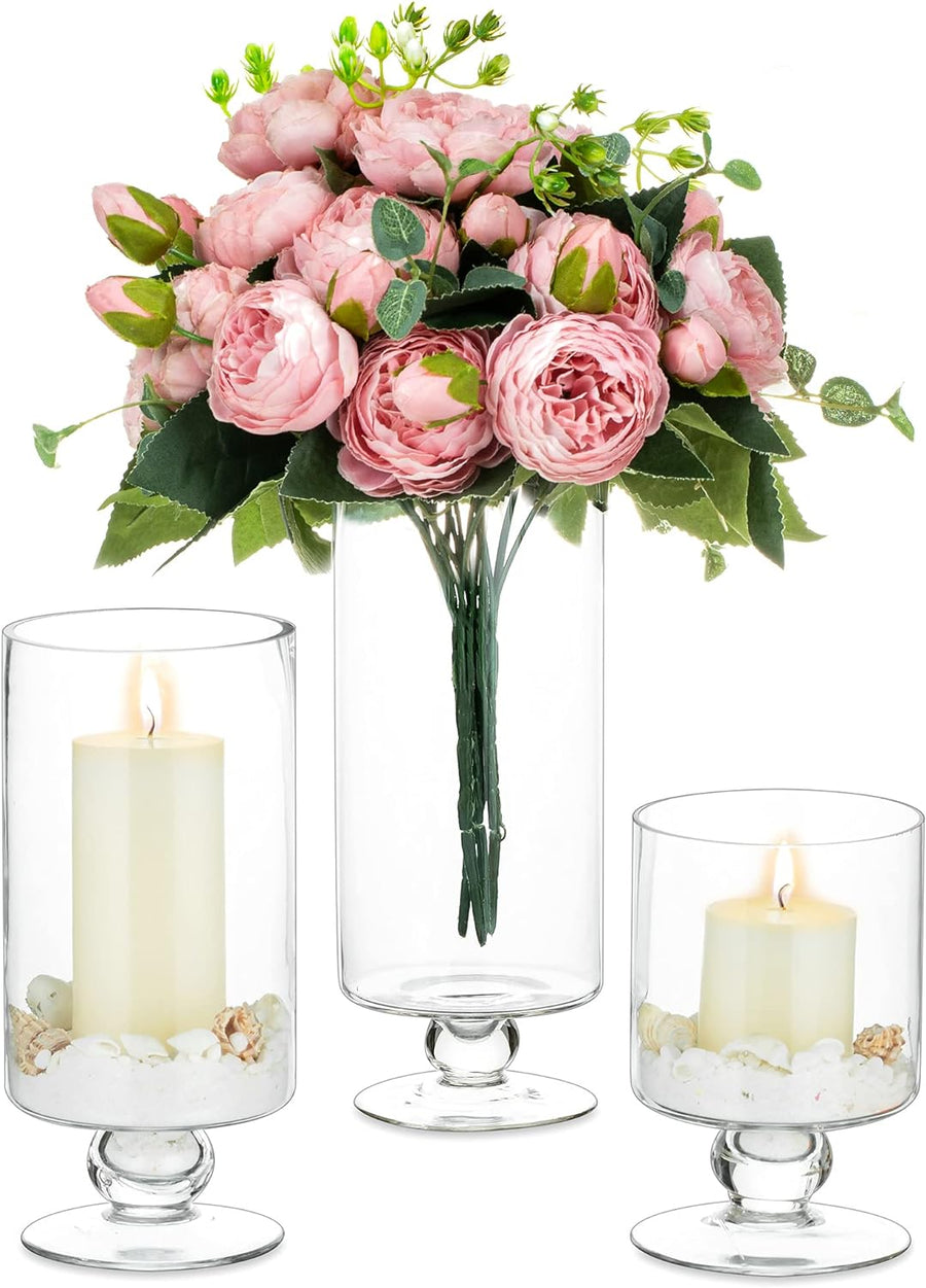 NUPTIO 3 Stück/Set Grosse Glasvase Glaskerzenhalter, Hurricane Kerzenhalter für Stumpenkerzen Hohe G