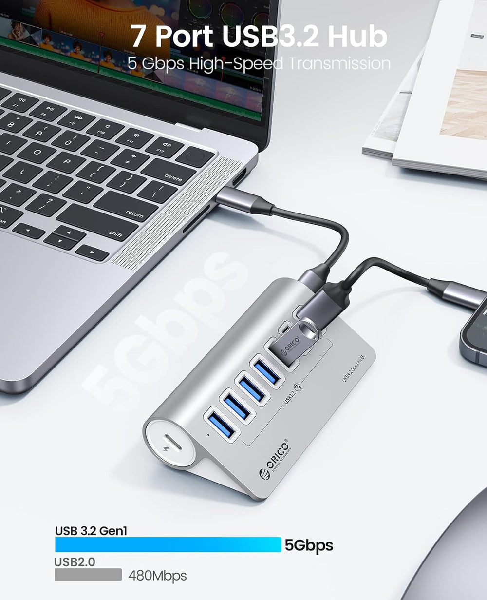 ORICO USB C Hub, 7 Port USB Hub 3.2 Gen 1, USB Verteiler 5Gbps Datenübertragung Port und einen Ladea
