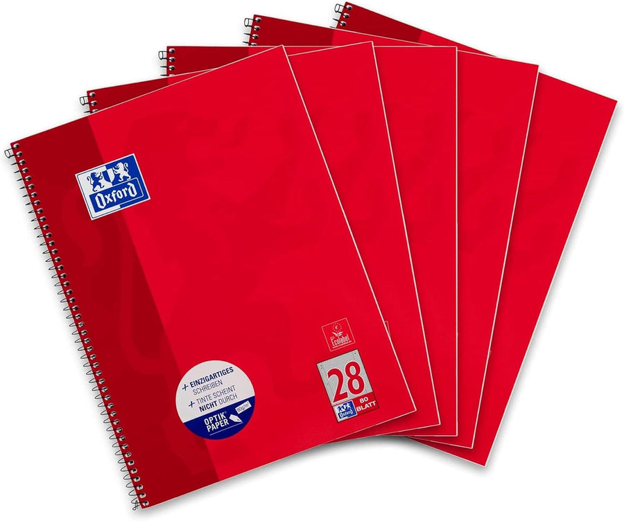 Oxford Collegeblock A4 kariert mit Doppelrand, 80 Blatt, rot, 5 Stück, 5 Stück