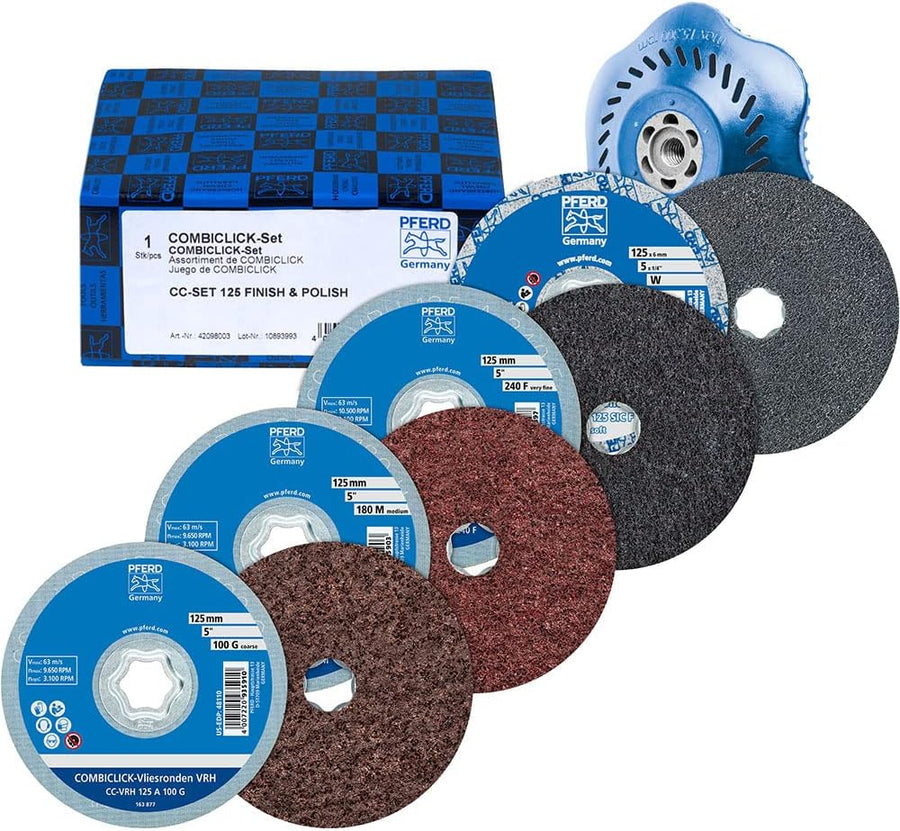 PFERD COMBICLICK Vlies-/Filzronden-Set, 5-teilig / Ø 125mm Korund A240, A180, A100, Siliciumcarbid S