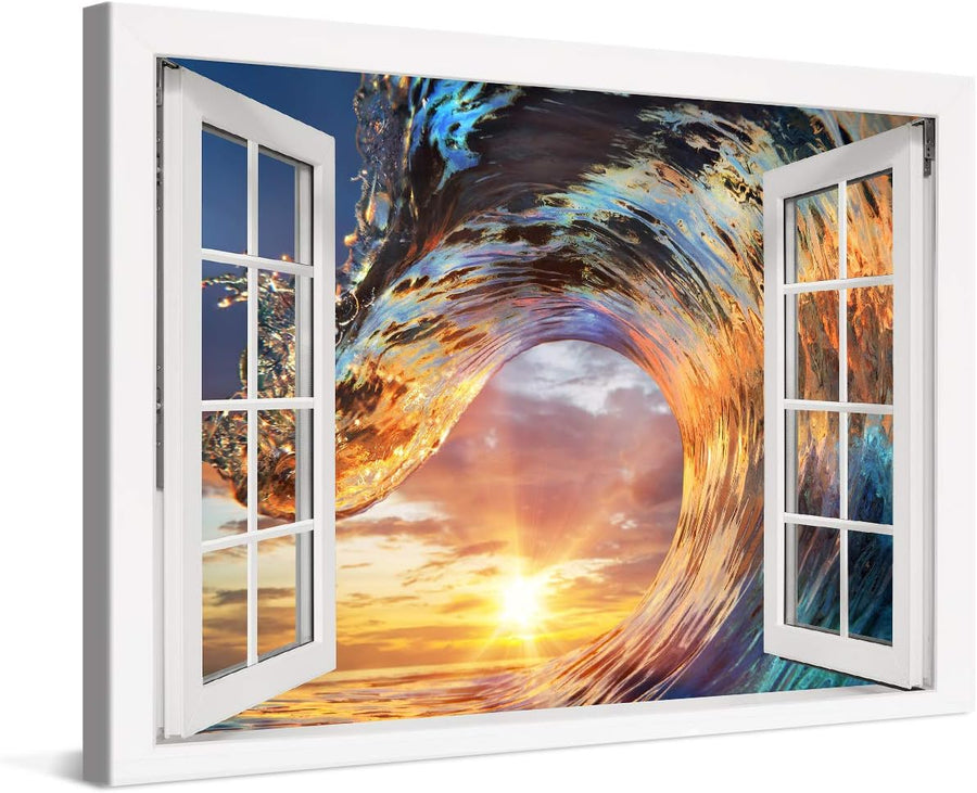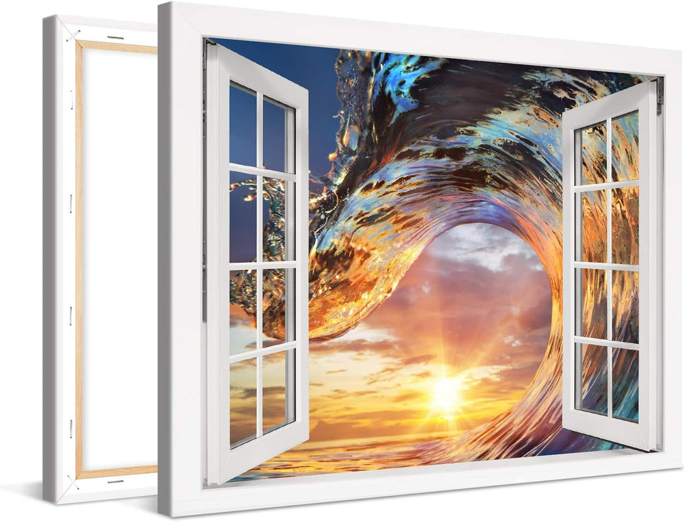 PICANOVA – Bild auf Leinwand Wellen-Sonnenuntergang Fenster 80x60cm – Leinwandbild – Premium Leinwan