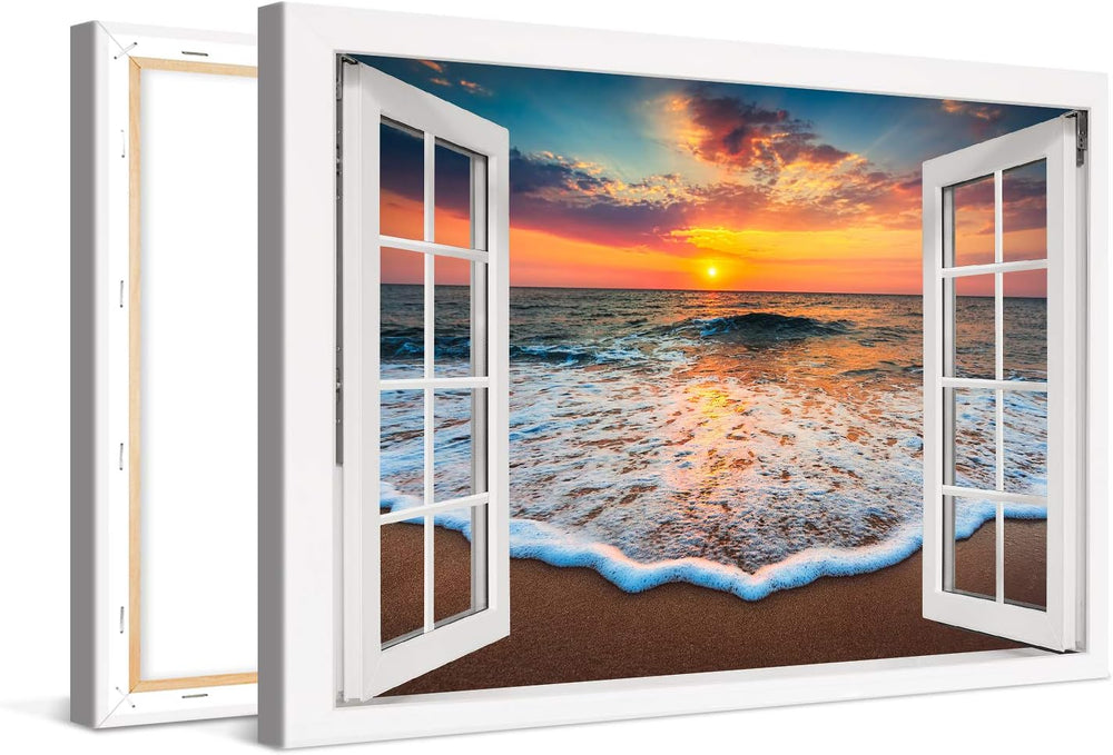 PICANOVA – Bild auf Leinwand Sonnenuntergang am Meer Fenster 60x40cm – Leinwandbild – Premium Leinwa