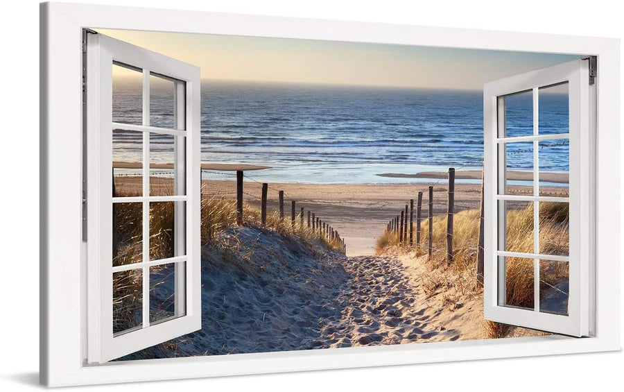 PICANOVA – Bild auf Leinwand Weg zum Meer Fenster 100x75cm – Leinwandbild – Premium Leinwanddruck –