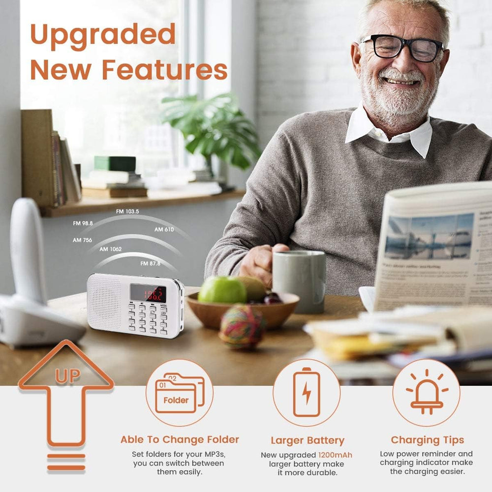 PRUNUS Kleines Radio. Tragbares Radio mit Grosse Batteriekapazität (3000mAh),Uhr FM SD USB MP3 UKW R
