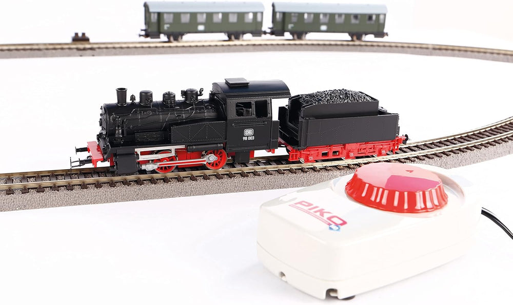 Piko 57112 Start-Set mit Bettung mit Personenzug der DB, Dampflok mit Tender und zwei Personenwagen