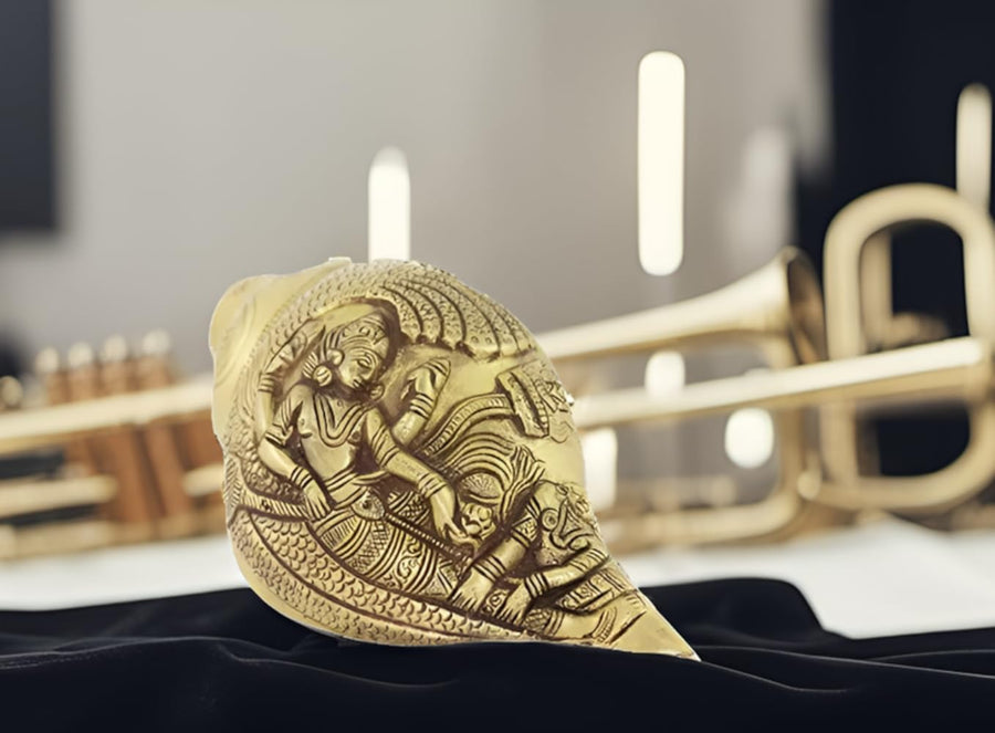 Purpledip Rare Collection Cruelty Free Vegan Blowing Shankh Conch in Antik-Finish Messing mit reichh