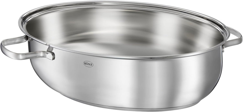 RÖSLE ELEGANCE Bräter oval, Hochwertiger Bräter mit Glasdeckel, Edelstahl 18/10, silberfarben, backo