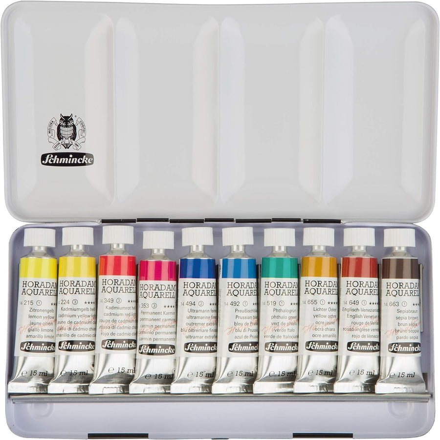 Schmincke – HORADAM AQUARELL Farbkasten, 10 x 15 ml Tuben, Grundsortiment, 74510097, Metallkasten, h